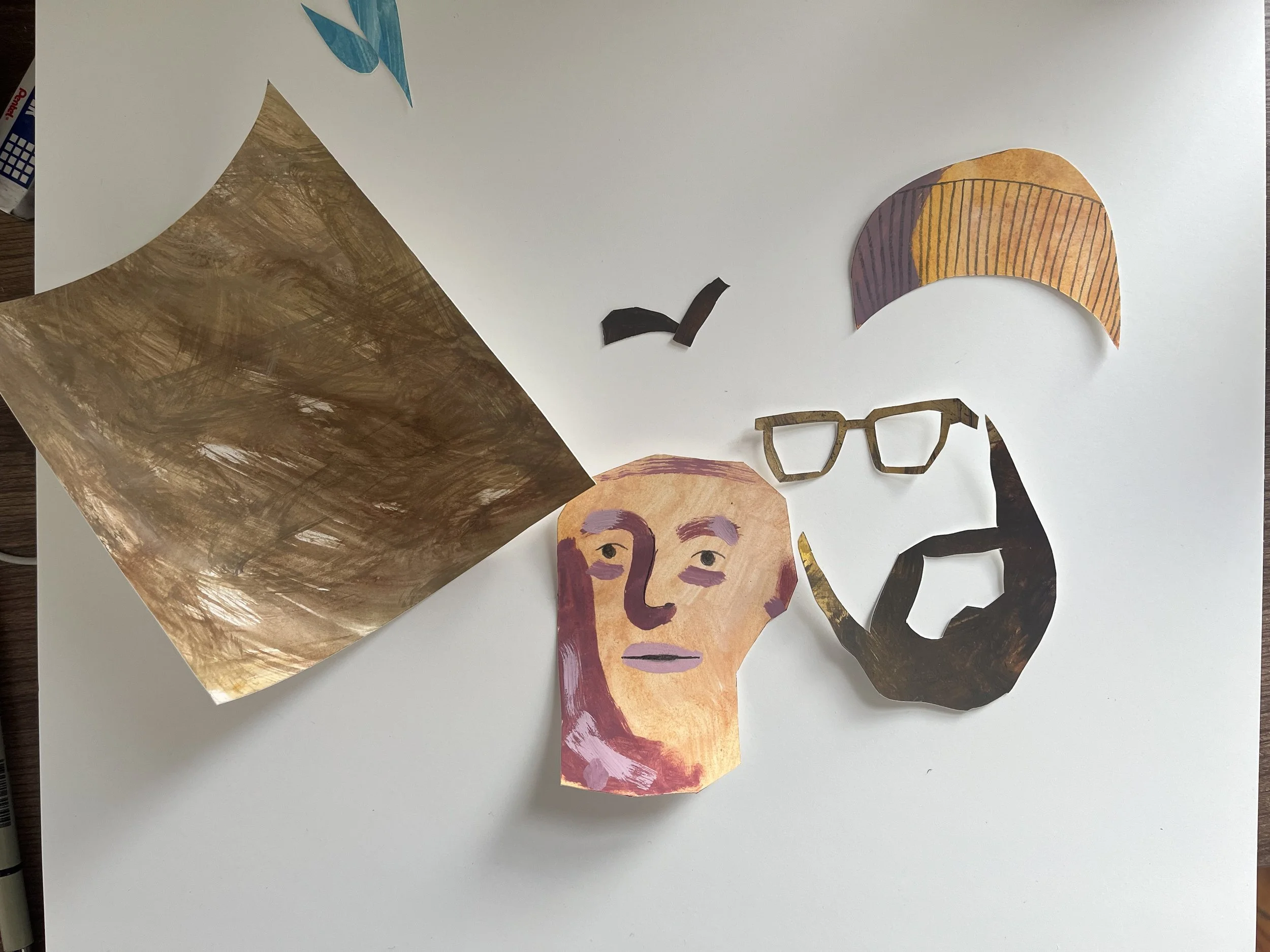 Using some bristol paper, I painted a bunch of abstract washes and cut out the hat and beard, face and glasses. Then I added some details to the face with paint and pencil.